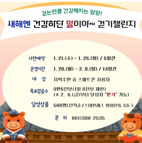 [참좋은뉴스= 기자] 담양군은 2026년 새해를 맞아 오는 1월 26일부터 2월 8일까지 온라인 걷기 챌린지 ‘새해엔 건강하단 말이야’를 운영한다고 밝혔다.