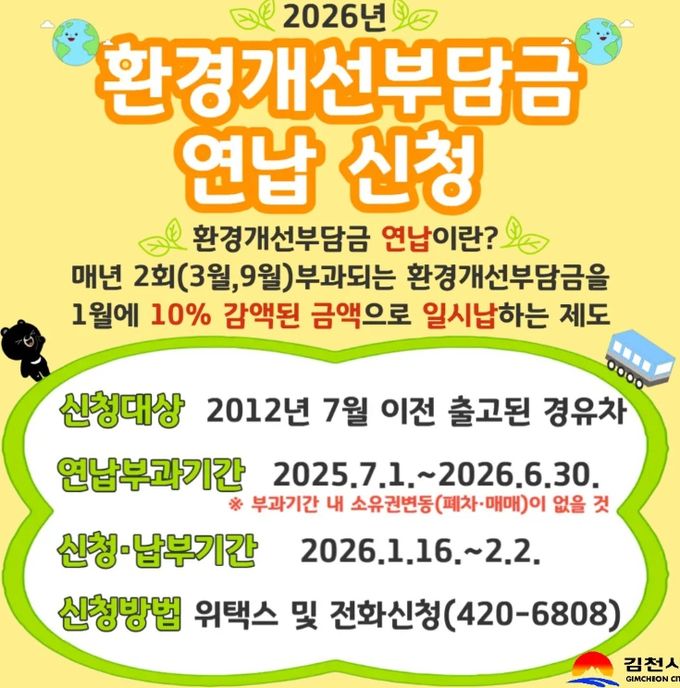 [참좋은뉴스= 기자] 김천시는 환경개선부담금 부과 대상 경유 자동차를 소유한 자를 대상으로 2026년 1월 16일부터 2월 2일까지 환경개선부담금 일시 납부(연납) 신청을 받는다.