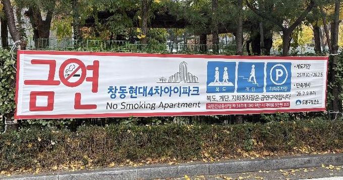 계도기간은 2월 6일까지다. 현재 아파트 동별 현관 입구 등에 금연구역 안내 현수막, 표지판이 부착돼 있다.