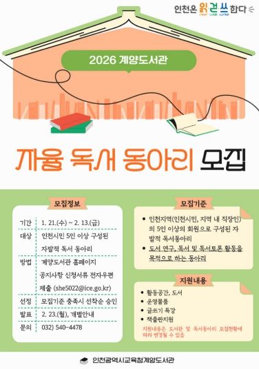 [참좋은뉴스= 기자] 인천광역시교육청계양도서관은 지역 내 독서 문화를 확산하고 시민의 자발적인 독서 활동을 지원하기 위해 ‘2026년 자율 독서동아리’를 모집한다.
