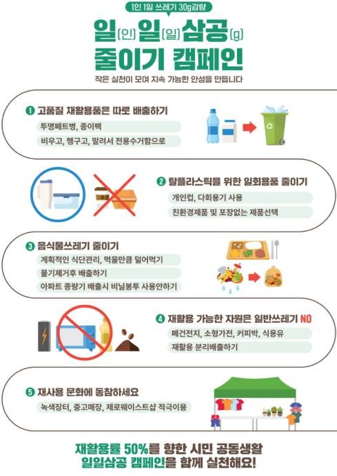 [참좋은뉴스= 기자] 안성시는 시민의 자발적인 실천을 통해 재활용률을 높이고 생활쓰레기 발생량을 줄이기 위한 ‘1인 1일 쓰레기 30그램 줄이기(일일삼공) 캠페인’을 적극 추진하고 있다고 밝혔다.