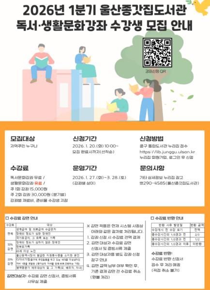 [참좋은뉴스= 기자] 울산 중구에서 운영하는 울산종갓집도서관이 2026년 1분기 독서·생활문화강좌 수강생을 모집한다