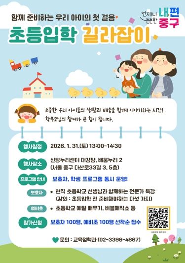 [참좋은뉴스= 기자] 서울 중구가 ‘2026 초등입학 길라잡이’ 설명회를 오는 31일 오후1시부터 신당누리센터 대강당에서 개최한다. 예비 초등학생과 학부모를 대상으로 약 1시간 반 동안 현직 교사가 첫 학교생활에 대한 궁금증을 해소해 줄 예정이다.