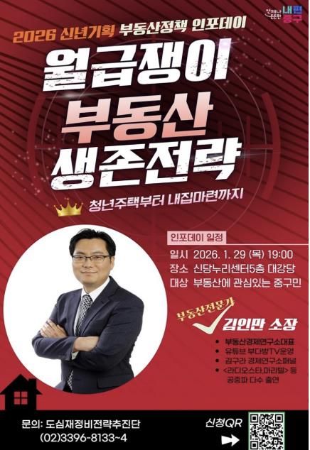 [참좋은뉴스= 기자] 서울 중구가 급변하는 부동산 환경 속에서 주민들의 현실적인 대응 전략을 돕기 위해 오는 29일 저녁 7시 신당누리센터 5층 대강당에서 올해 첫 도시런(learn) 스쿨‘신년기획 부동산 전략 인포(INFO)데이’를 연다.