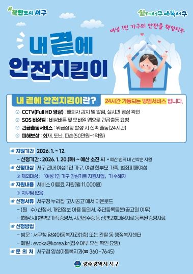 [참좋은뉴스= 기자] 광주광역시 서구는 여성 1인 가구 등의 주거 안전을 위한 ‘안전지킴이 지원사업’을 추진한다.