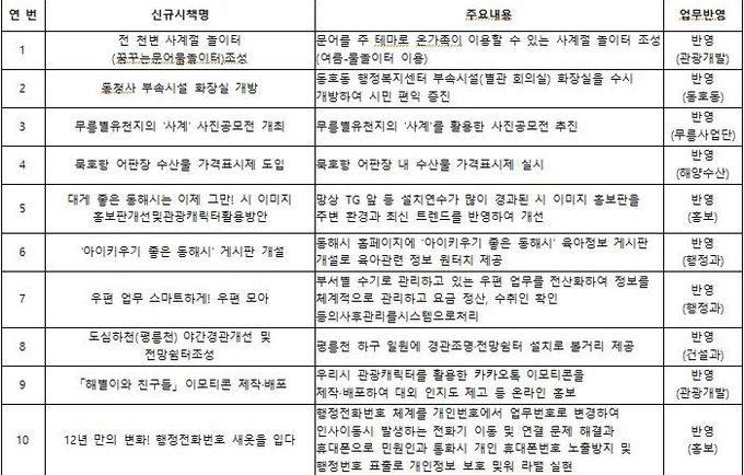 동해시는 지난 2024년부터 직원 제안 정책 발굴 제도를 운영해 왔으며, 직원들이 제안한 아이디어 55건 가운데 10건의 신규 시책을 실제 시정에 반영해 추진하는 성과를 거뒀다.
