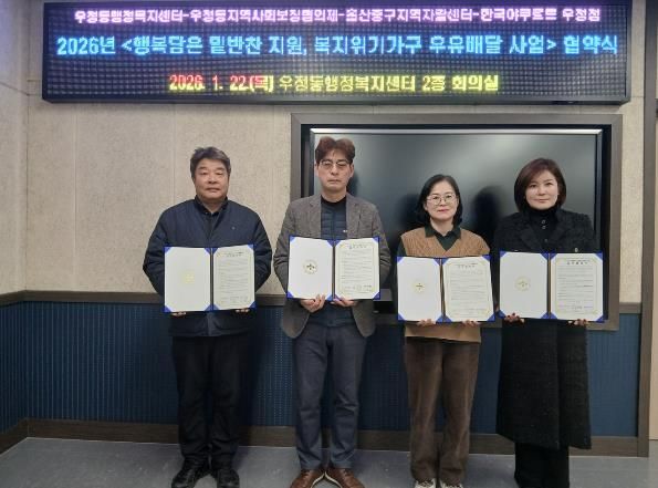 [참좋은뉴스= 기자] 울산 중구 우정동 행정복지센터와 우정동 지역사회보장협의체가 지난 1월 22일 오후 4시 우정동 행정복지센터 회의실에서 울산중구지역자활센터와 ‘행복담은 밑반찬 지원 사업’, 한국야쿠르트 우정점과 ‘복지위기가구 우유배달 지원사업’ 업무협약을 체결했다.