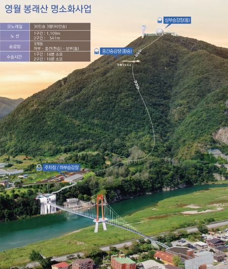 봉래산 명소화사업은 영월읍 영월역(덕포리)에서 영흥리로 연결되는 동강보도교, 금강공원에서 해발 799m 봉래산 정상까지 연결되는 모노레일, 영월읍 일원을 조망할 수 있는 전망시설(타워, 센터, 돔)로 구성된 사업이다.