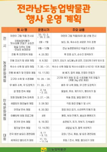 전통 농경문화 조사·연구·전시·학술 활동 등의 전문성을 강화하고, 도민 문화 향유 기회 확대를 위해 이색 특별전시회와 학술행사도 추진한다.
