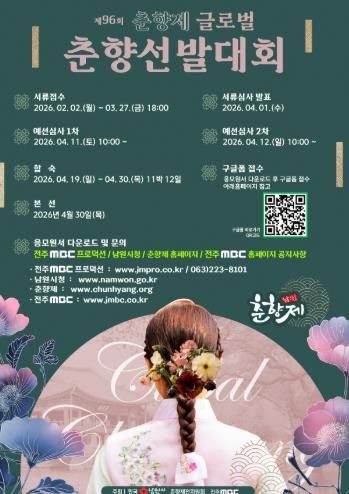 [20260202112252-88250][참좋은뉴스= 기자] 남원시는 제96회 춘향제를 맞아 ‘글로벌 춘향선발대회’ 참가자를 2월 2일부터 3월 27일까지 모집한다.