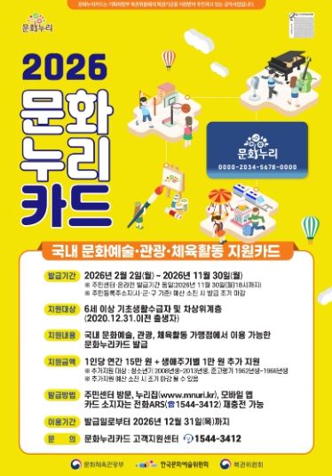 시 관계자는 “문화누리카드 지원 확대를 통해 문화취약계층의 문화 향유 기회가 확대되길 기대한다”며, “앞으로도 생애주기별 맞춤형 정책을 지속적으로 추진하고 홍보하겠다”고 말했다.