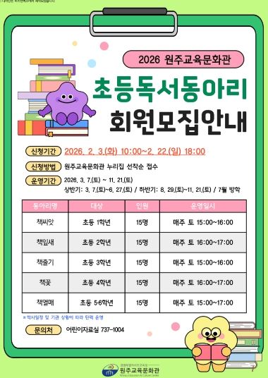 [참좋은뉴스= 기자] 원주교육문화관(관장 용석태)은 2월 3일부터 선정 도서를 깊이 읽는 활동을 통해 문해력을 강화하고 지역사회 독서 공동체를 활성화하기 위해 초등학생과 중학생을 대상으로 ‘2026년 독서동아리 회원 모집’을 실시한다.