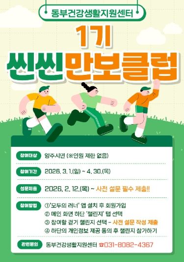[참좋은뉴스= 기자] 양주시보건소 동부 건강생활지원센터에서는 지역 주민의 건강생활실천율 향상 및 비만율 개선을 위해 2026년도 ‘씬씬 만보클럽’ 1기 참여자를 모집한다.