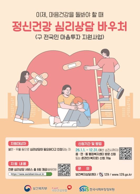 [참좋은뉴스= 기자] 옥천군은 우울·불안 등 정서적 어려움을 겪고 있는 주민에게 전문적인 심리상담 서비스를 제공하는‘심리상담 바우처 지원사업(구 전국민 마음투자 지원사업)’ 대상자를 모집한다고 밝혔다.