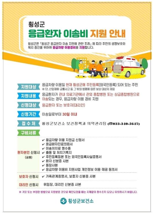 [참좋은뉴스= 기자] 횡성군보건소는 군민의 응급 의료 안전망 강화를 위해 ‘응급환자 이송비 지원사업’을 올해도 지속 추진한다고 밝혔다.