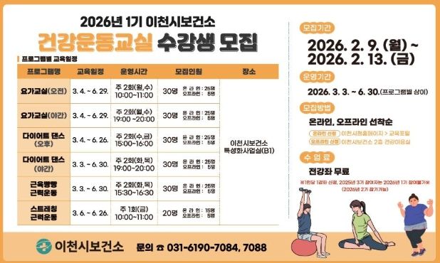 [참좋은뉴스= 기자] 이천시보건소는 시민들이 건강생활을 실천할 수 있도록 ‘2026년 건강운동교실 1기’ 참여자를 선착순으로 모집한다.