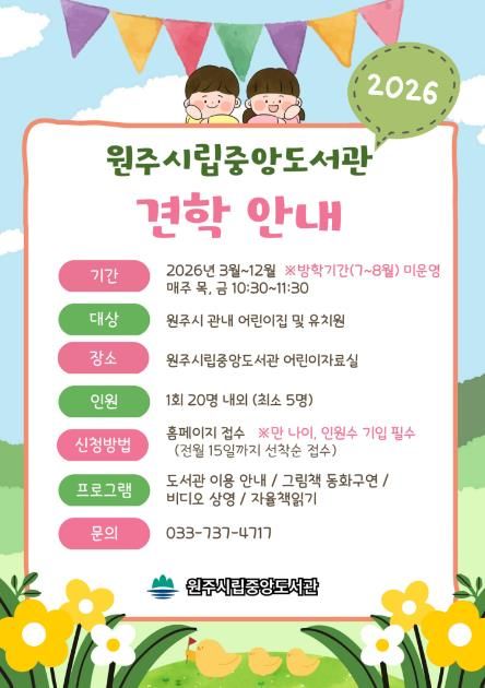 [참좋은뉴스= 기자] 원주시립중앙도서관은 오는 3월부터 12월까지 관내 유치원과 어린이집을 대상으로 도서관 견학 프로그램을 운영한다.
