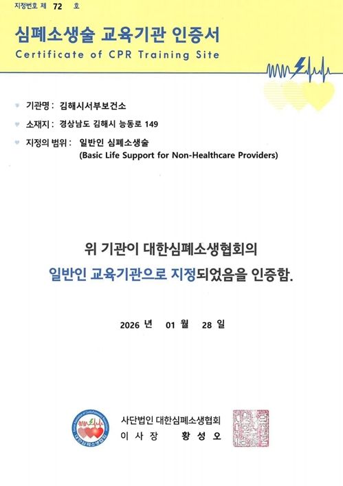 [참좋은뉴스= 기자] 김해시는 김해시서부보건소가 대한심폐소생협회(KACPR)로부터 ‘일반인 심폐소생술 교육기관(TS)’으로 공식 지정됐다고 6일 밝혔다.