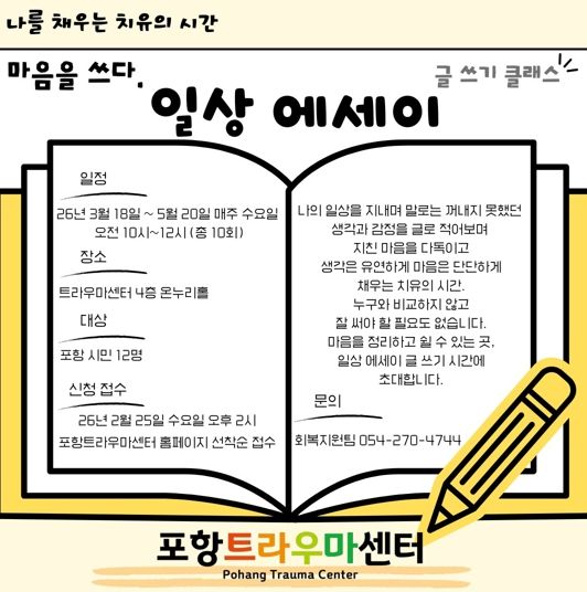 [참좋은뉴스= 기자] 포항시 북구보건소 트라우마센터는 문학 치유 프로그램인 ‘2026년 마음을 쓰다: 일상 에세이’ 글 쓰기 참여자를 모집한다.