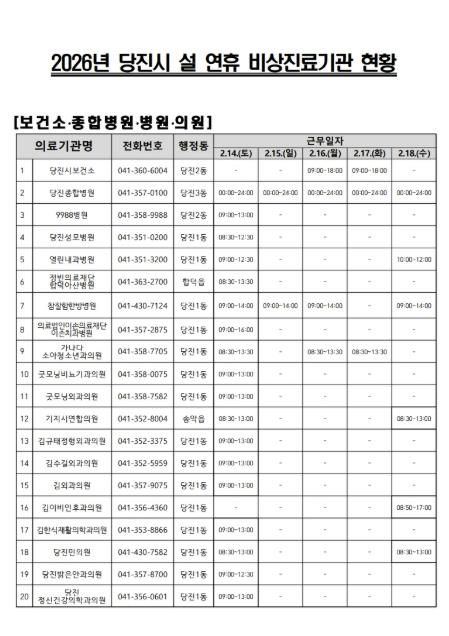 한편, 당진시보건소는 2월 16일과 17일(오전 9시~오후 6시) 진료실을 운영하며, 연휴 전 기간 재난 및 다수 사상자 발생 상황에 대비해 ‘응급의료지원반’을 편성하여 즉각적인 대응 체계를 가동한다.