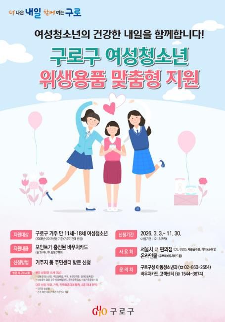 [참좋은뉴스= 기자] 구로구가 3월부터 관내 여성청소년을 대상으로 생리용품(위생용품) 바우처 지원 사업을 시행한다. 구는 기존 학교·청소년시설 비치 방식에서 바우처카드 방식으로 전환해 청소년의 이용 편의와 제품 선택권을 강화했다.