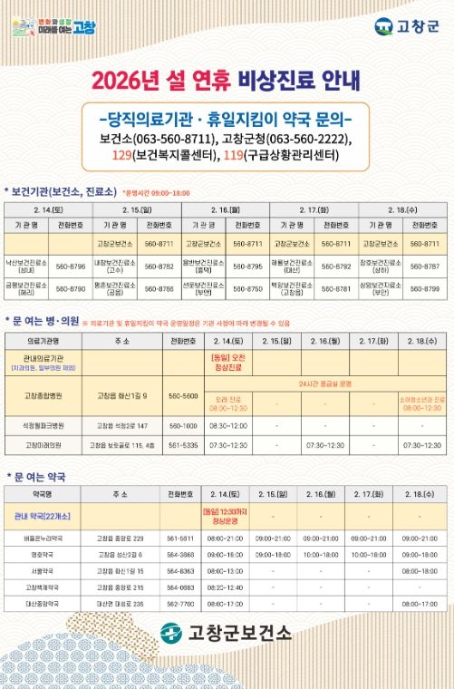 [참좋은뉴스= 기자] 고창군이 설 연휴(14~18일) 군민의 건강을 지키고, 의료 이용 불편을 최소화하기 위해 비상진료체계를 가동한다.