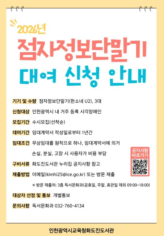 [참좋은뉴스= 기자] 인천광역시교육청화도진도서관은 인천 거주 시각장애인을 대상으로 ‘점자정보단말기 무상대여 사업’을 운영한다고 9일 밝혔다.