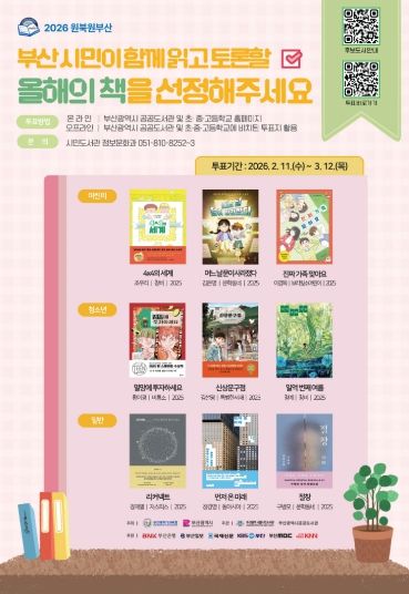 부산광역시립시민도서관(관장 이은경)은 2026 원북원부산 올해의 책 선정을 위해 2월 11일부터 3월 12일까지 어린이, 청소년, 일반 후보도서 9권에 대해 시민투표를 실시한다.