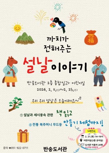 [참좋은뉴스= 기자] 부산광역시립반송도서관(관장 박미양)은 우리나라 대표 전통 명절 설날을 맞아 사학특성화 프로그램 ‘까치가 전해주는 설날 이야기’를 오는 11일부터 25일까지 운영한다.