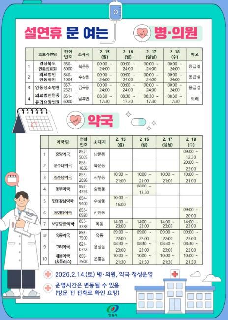 연휴 기간 문 여는 병․의원이나 약국은 전화, 인터넷, 스마트폰 앱을 통해 쉽게 안내받을 수 있으며, 안동시청 및 보건소 누리집, 응급의료포털, 스마트폰 앱(응급의료정보제공)에서 확인할 수 있다.