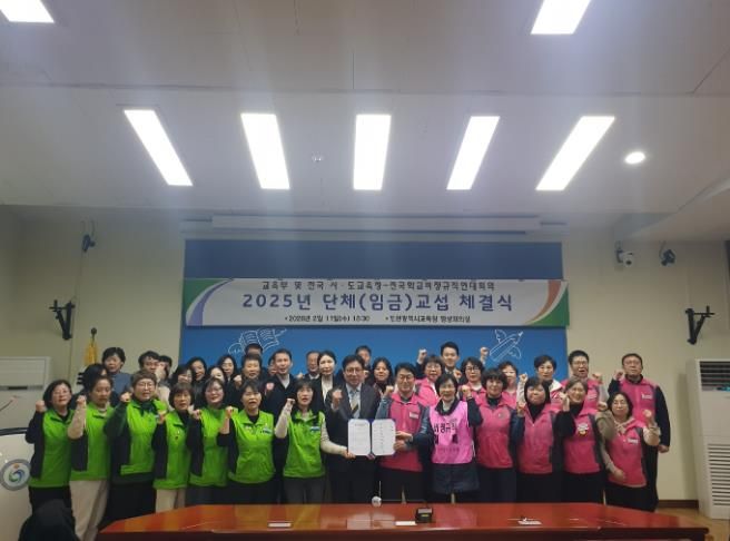 [참좋은뉴스= 기자] 울산광역시교육청을 포함한 전국 17개 시도교육청이 11일 인천광역시교육청에서 전국학교비정규직연대회의와 ‘2025년 집단 임금 교섭 체결식’을 열었다.