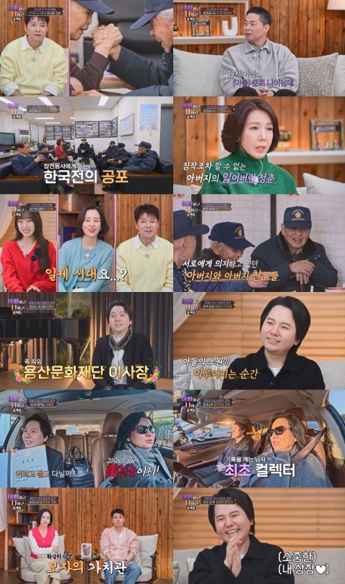 이어 전수경은 아버지와 아버지의 전우들에게 식사 대접을 하기 위해 중식집을 찾았다. 게살수프가 나오자 전수경의 아버지는 “일제 시대에 메밀묵 썰어 다니던 게 생각난다”며 역대급 맛 표현에 나섰다. 이에 놀란 전수경이 “일제 강점기 때 학교 다니셨겠다”고 거들자 회장은 “초등학교 4학년 때 해방됐다. 초등학교 졸업식이 6월 28일이었는데, 25일 사변이 생겨서 졸업도 못했다”고 안타까운 사연을 밝혔다. 한창 꽃피울 나이에 끼니도 챙기지 못하고 인권마저 전무한 전장으로 향했던 어린 병사들의 생생한 경험담은 먹먹함을 안겼다. 전수경은 “가족 속에 있는 아버지만 봐서 친구 혹은 동료분들과 함께 있는 모습이 궁금했다. 사람으로부터 더 에너지를 받아 갈 수 있는 그런 모습을 볼 수 있어서 좋았다”며 아버지의 삶을 함께 걸어본 듯 소중한 시간에 대한 소감을 전했다.