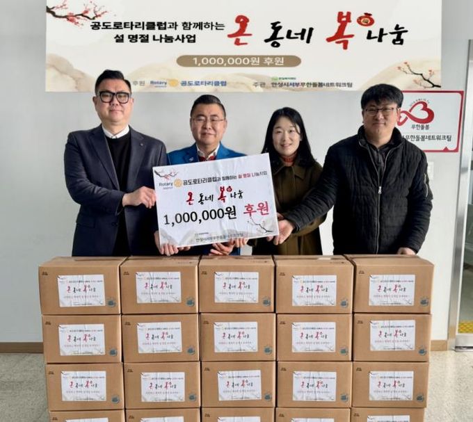[참좋은뉴스= 기자] 사회복지법인 한길복지재단이 수탁 운영하는 안성시서부무한돌봄네트워크팀은 국제로타리 3600지구 공도로타리클럽과 지난 12일 설 명절 나눔사업 ‘온동네 복나눔’ 후원금 100만 원 전달식을 가졌다.