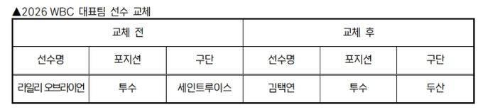 [참좋은뉴스= 기자] KBO 전력강화위원회는 부상으로 인해 WBC 참가가 어려워진 세인트루이스 라일리 오브라이언을 대체할 선수로 두산 김택연을 확정하고 WBC 조직위에 선수 교체 승인을 요청했다.
