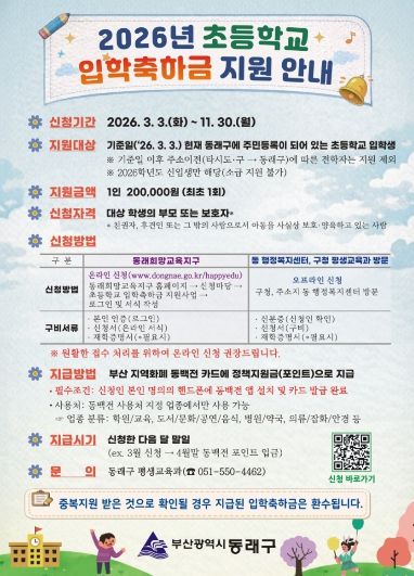 동래구 관계자는 “신입생을 둔 가정의 교육비 부담을 조금이라도 덜어드리고자 올해 처음으로 초등학교 입학축하금을 지원하게 됐다”라며 “앞으로도 교육의 공공성 강화와 교육복지 실현을 위해 다양한 지원 정책을 마련해 나가겠다”라고 말했다.