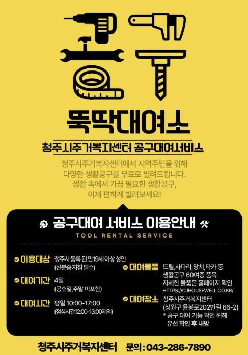 공구 목록 확인과 대여 안내는 청주시주거복지센터 누리집에서 가능하며, 자세한 사항은 청주시 복지정책과 또는 청주시주거복지센터로 문의하면 된다.