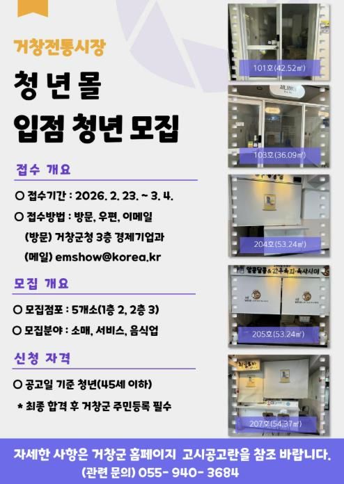 이번 모집은 확대 창업 등으로 발생한 빈 점포 5개소를 대상으로 진행된다. 신청 자격은 19세 이상 45세 이하 청년이면 누구나 가능하며, 신청 기간은 2월 23일부터 3월 4일까지다. 거창군 누리집에 게시된 공고문을 확인한 뒤 구비서류를 갖춰 군청 경제기업과 방문 또는 이메일로 신청하면 된다.