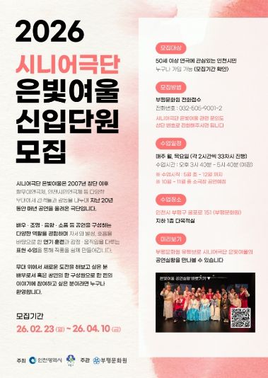 부평문화원 관계자는 “20년의 시간을 이어온 ‘은빛여울’이 올해도 새로운 무대를 준비하고 있다”며 “공연을 통해 의미 있는 경험을 쌓고 싶은 시민 여러분의 많은 관심과 참여를 바란다”고 말했다.