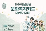 [참좋은뉴스= 기자] 담양군은 관내 청년을 대상으로 문화생활 향유 및 자기 계발 기회를 제공하고자 전남청년 문화복지카드 지원사업을 추진한다고 9일 밝혔다. 주소지 읍·면 사무소 방문 신청은 2월 9일부터 3월 31일까지, 농협카드 누리집 신청은 2월 20일부터 3월 31일까지 가능하며 기존 수혜자도 반드시 다시 신청해야 한다. 다만 공공기관 근무자, 학교 밖 청소년 수당 대상자, 여성농업인 행복바우처 대상자는 제외되며, 문화누리카드 수혜자는 중복 지원을 받을 수 있다. 2024년 2월 9일 이전부터 도내 거주한 19~28세 청년을 대상으로 하며, 연 25만 원의 문화복지비가 지원된다. 지원금은 문화·공연 관람, 학원 수강, 도서 구입 등 문화·여가 및 자기 계발 분야에서 사용할 수 있으며, 전남 도내에서 올해 안에 모두 사용해야 한다. 군 관계자는 “전남청년 문화복지카드 지원사업을 통해 청년들의 문화 참여 기회를 넓히고 삶의 질을 높이는 계기가 되길 바란다”라며 “앞으로도 청년의 수요를 반영한 문화·복지 정책을 추진해 청년이 머물고 성장할 수 있는 담양을 만들어 가겠다”라고 말했다.