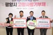 [참좋은뉴스= 기자] 광양시는 6일 광양시청에서 광양 출신 향우 2명이 고향에 대한 애정과 응원의 마음을 전하는 ‘고향사랑기부금 전달식’을 개최했다고 밝혔다. 이날 전달식에는 미라클YT펌프 원영태 대표와 광양본가기정떡 박용무 대표가 참석해 각 100만 원씩 총 200만 원의 고향사랑기부금을 시에 전달했다. 이번 기부는 지방재정 확충과 지역경제 활성화를 목적으로 추진되고 있는 고향사랑기부제의 취지에 공감한 기부자들이 자발적으로 참여해 더욱 의미를 더했다. 특히 원영태 대표는 3년 연속으로 고향사랑기부제에 동참하며 꾸준한 기부 실천을 통해 지역 사랑과 나눔 문화 확산에 앞장서고 있다. 원영태 대표는 “고향 광양에 대한 마음을 담아 지역 발전에 조금이나마 보탬이 되고자 참여했다”며 “이번 기부가 고향사랑기부제의 취지를 널리 알리고, 더 많은 시민과 향우의 참여로 이어지는 계기가 되길 바란다”고 말했다. 박용무 대표는 “지역과 함께 성장해 온 만큼, 앞으로도 지역과 상생할 수 있는 다양한 방법을 지속적으로 고민하겠다”고 밝혔다. 광양시 관계자는 “광양 발전을 위해 늘 아낌없는 응