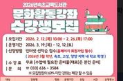[참좋은뉴스= 기자] 속초교육도서관은 관내 학생 및 학부모·지역주민들의 지속 가능한 배움을 통한 자기성장을 위해 ‘2026년 문화활동강좌’ 수강생을 모집한다. 이번 강좌는 3월 19일부터 12월 12일까지 운영되며, 초등학생 대상 △어린이 글로 표현하는 세상 등 7개 강좌, 중·고등학생 대상 △핵심을 잡아주는 고등논술 등 2개 강좌, 학부모·지역주민 대상 △포토샵 자격증반 등 5개 강좌로 총 14개 프로그램이 운영된다. 수강 신청은 2월 12일부터 2월 26일까지 속초교육도서관 누리집을 통해 신청 가능하며, 스마트폰 활용교육 강좌는 방문을 통해 선착순으로 신청할 수 있다. 김주희 관장은 “지역주민 누구나 학습을 통해 배우고 성장할 수 있도록 평생교육의 기회를 지속적으로 확대·지원할 것이다.”라고 전했다. 자세한 내용은 속초교육도서관 누리집 공지사항을 참고 하거나 담당자에게 문의하면 된다. [뉴스출처 : 강원특별자치도교육청]