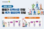 [참좋은뉴스= 기자] 한국고용정보원(원장 이창수)은 '중장기 인력수급 전망'을 통해 향후 10년간 우리나라 노동시장의 인력공급(경제활동인구)과 인력수요(취업자)가 구조적으로 전환되는 양상을 전망하고, 향후 지속적인 성장을 위해 추가로 필요한 인력을 추계했다. 1.중장기 인력수급 전망(2024~2034) 주요 전망 결과를 보면, 15세 이상 인구 증가 폭은 과거에 비해 크게 둔화되고, 경제활동인구는 2030년부터는 본격적인 감소세로 전환될 것으로 나타났다. 저출생·고령화의 영향으로 생산가능인구(15~64세)는 지속적으로 감소하는 반면, 65세 이상 고령층 비중은 2034년 31.7%까지 확대되면서 노동 공급의 구조적 제약이 본격화될 전망이다. 이로 인해 15세 이상 전체 경제활동참가율은 전망 전기(‘24~’29년)에 감소 전환하는 반면, 고령층과 여성의 경제활동참가율은 점진적으로 상승할 것으로 예상되어, 노동시장 내 고령화 심화와 인력 구성의 질적 변화가 동시에 진행될 것으로 보인다. 2024년~2034년까지 취업자 수는 6.4만 명 증가하겠으며, 노동공급 제약의 영향으로 2030년부