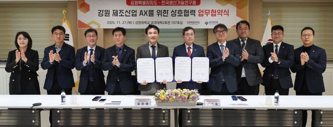 [참좋은뉴스= 기자] 강원특별자치도는 11월 27일 오후 3시, 강원 제조산업의 AX(AI Transformation, 인공지능 전환)를 위한 상호 협력을 강화하기 위해 한국생산기술연구원(원장 이상목)과 업무협약(MOU)을 체결했다.