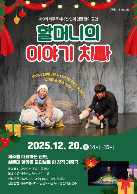 [참좋은뉴스= 기자] 제주시 우당도서관은 연말을 맞아 12월 20일 오후 2시 연극 ‘할머니의 이야기 치마’ 공연을 개최한다.