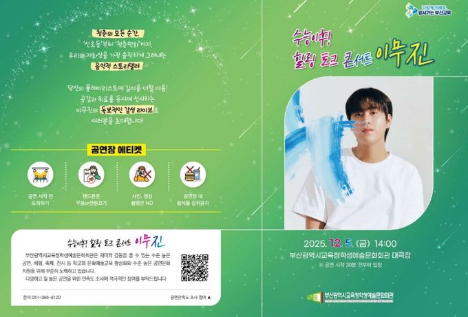 [참좋은뉴스= 기자] 부산광역시교육청학생예술문화회관(관장 박은혜)은 오는 5일 오후 2시 학생예술문화회관 대극장에서 수능을 마친 고3 학생 700여 명을 대상으로 가수 이무진과 함께하는 ‘수능 이후! 힐링 토크 콘서트’를 개최한다.