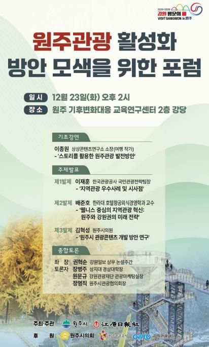 이번 포럼은 원주시와 강원일보가 공동으로 주최하고, 한국관광공사와 (재)강원관광재단이 후원한다. 원주 관광산업의 현주소를 진단하고 타 지역의 우수사례를 공유해, 원주관광의 발전 방향을 제시하는 자리이자, 원주 관광산업 활성화를 위한 다양한 방안과 대안을 모색하는 장이 될 전망이다.
