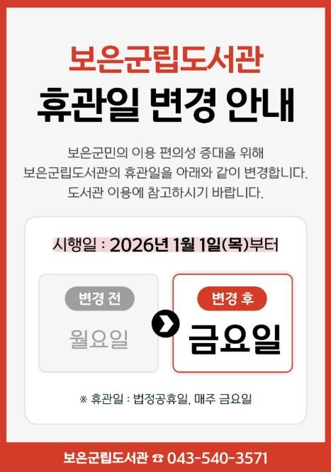 [참좋은뉴스= 기자] 보은군립도서관은 2026년 1월부터 정기휴관일을 기존 매주 월요일에서 금요일로 변경해 운영한다고 밝혔다.