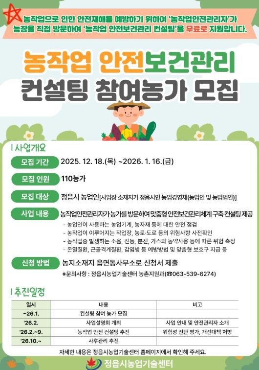 시는 ‘2026년 농작업 안전재해예방 지원체계 구축사업’의 일환으로 내년 1월 16일까지 ‘농작업 안전보건관리 컨설팅’에 참여할 농가를 모집한다고 22일 밝혔다.