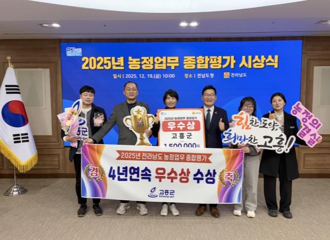 [참좋은뉴스= 기자] 고흥군이 전라남도가 주관한 ‘2025년 농정업무 종합평가’에서 4년 연속 ‘우수상’을 수상하며, 농업 강군(强郡)으로서의 위상을 다시 한번 입증했다.
