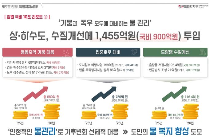 [참좋은뉴스= 기자] 강원특별자치도는 내년도에 1,455억 원을 투입하여 가뭄 및 집중호우 등 물로 인한 기후변화와 자연재해로부터 안전한 강원자치도를 만들어 나갈 계획을 밝혔다.